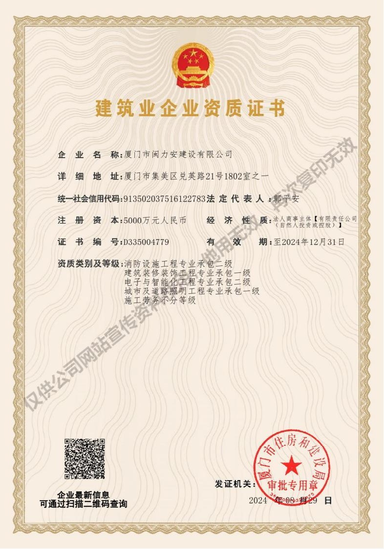 廈門市閩力安建設(shè)有限公司成立于2003年,公司取得市政公用工程施工總承包貳級(jí)、建筑裝修裝飾工程專業(yè)承包壹級(jí)、城市及道路照明工程專業(yè)承包壹級(jí)、電子與智能化工程專業(yè)承包貳級(jí)、消防設(shè)施工程專業(yè)承包貳級(jí)、電力工程施工總承包叁級(jí)、建筑機(jī)電安裝工程專業(yè)承包叁級(jí)、輸變電工程專業(yè)承包叁級(jí)、環(huán)保工程專業(yè)承包叁級(jí)、照明工程設(shè)計(jì)專項(xiàng)甲級(jí)、建筑裝飾工程設(shè)計(jì)乙級(jí)、施工勞務(wù)等資質(zhì)的綜合型企業(yè),公司于2013年通過了ISO9001質(zhì)量體系認(rèn)證,ISO14001環(huán)境管理體系認(rèn)證,OHSAS18001職業(yè)健康安全管理體系認(rèn)證。